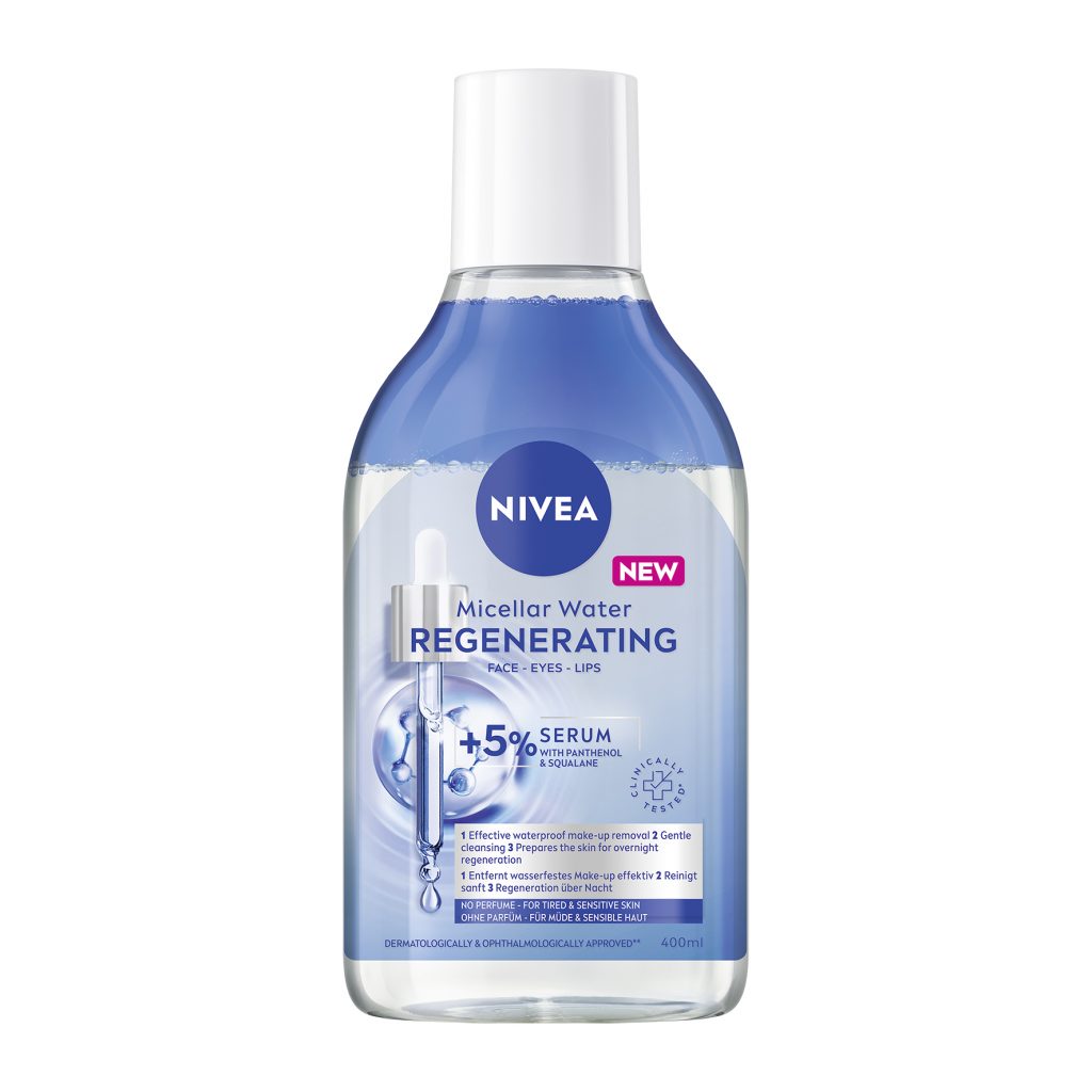 NIVEA Mizellenwasser Regenerating: Diese Formel ist mit 5 % Serum, mit Panthenol und Squalane angereichert, um die Haut intensiv mit Feuchtigkeit zu versorgen und ihre Regeneration über Nacht zu unterstützen. Sie stärkt die natürliche Hautbarriereund stimuliert die natürlichen Regenerationsprozesse. Die Formel eignet sich ideal für müde und sensible Haut, die sich nach Erholung und Regeneration sehnt. Die Formel mit Squalane verbessert die Hautfeuchtigkeit – bereits nach der ersten Anwendung um 14 % und nach zwei Wochen um bis zu 25 %. Panthenol unterstützt unsere Hautregeneration, verbessert ebenfalls die Hautfeuchtigkeit und die Elastizität. Hautrötungen werden außerdem gemindert.